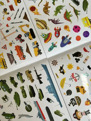 В альбоме 500 наклеек с красочными изображениями и страницы, где можно размещать наклейки.