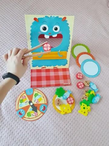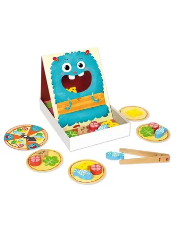 Занимательная игра от Goula прекрасно подойдет для развития логического мышления, памяти, творческих способностей и концентрации, а также позволит улучшить моторные навыки ребенка. Игровой набор, сочетающий в себе разные материалы и текстуры, имеет два уровня игры: сначала нужно приготовить пиццу из 4 ингредиентов по мере их появления на колесе рулетки или, если нужных ингредиентов нет, накормить ими монстра.