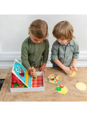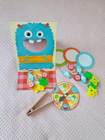 В комплекте: 1 прищепка -пинцет, 12 деревянных деталей продуктов, 8 кусков войлока, 1 вертушка, 4 картонных тарелки и 1 монстр.