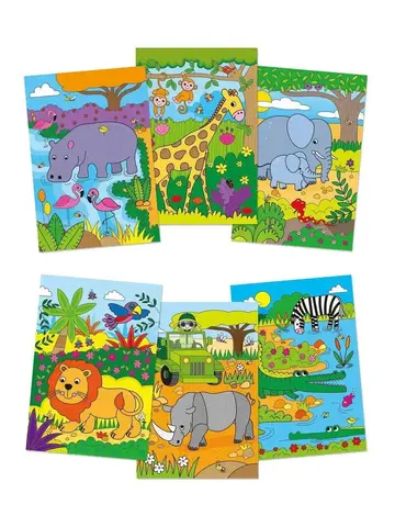 Раскраска из 6 картинок, которые можно раскрашивать снова и снова. Картинка высыхает и снова готова к раскрашиванию.