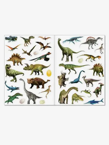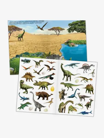 Бюджетные многоразовые наклейки "Динозавры" - это поле с изображением среды обитания динозавров и 35 наклеек с изображениями представителей мира динозавров.