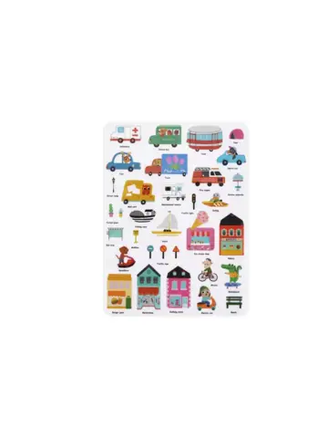 Каждая наклейка демонстрирует различные элементы городской жизни, предметы, предлагая детям возможность узнать об окружающем мире в увлекательном формате.