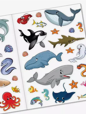 Бюджетные многоразовые наклейки "Морские животные " - это поле с изображениями контуров морских обитателей и 45 наклеек с изображениями (например кальмара, кашалота, ската, угря, морской звезды, белухи и других)
