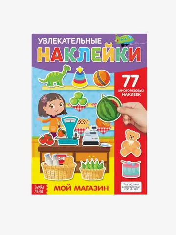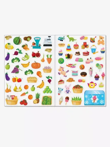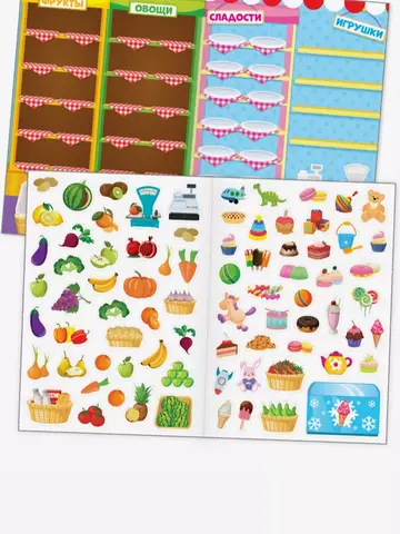 Бюджетные многоразовые наклейки "Мой магазин" - это поле с изображением торгового прилавка магазина и 77 наклеек с изображениями фруктов, овощей, сладостей и игрушек.