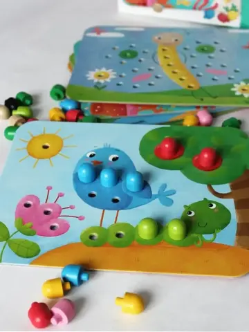 В наборе 60 разноцветных деревянных гвоздиков и 6 картинок (5 из них с избражениями кошки, собаки, рыбки, птички, бабочки и 1 рабочее поле черного цвета для самостоятельной фантазийной работы).