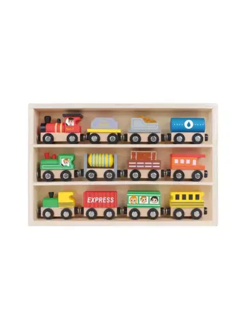 Шикарный набор от Tooky Toy в деревянной коробке. Железнодорожный состав из паровозов и различных грузовых вагончиков на магнитной сцепке. 12 деревянных подвижных элементов транспорта.